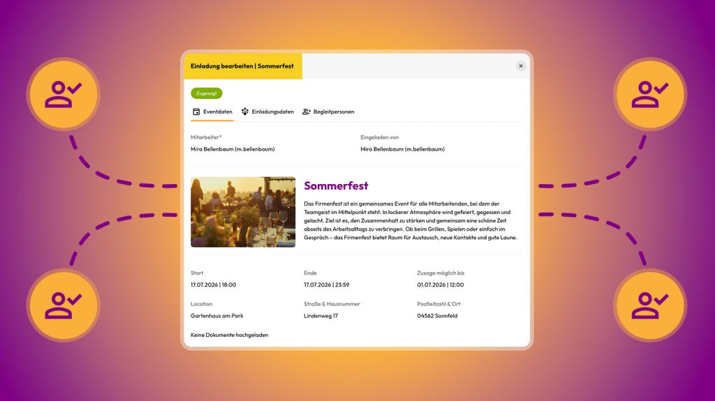 Du planst ein Sommerfest, einen Gesundheitstag oder ein kleines Offsite für dein Team? Mit dem zubuchbarem Event-Management-Modul erstellst du Veranstaltungen inklusive Einladungen, Teilnehmermanagement und Extras wie Essenswünsche oder Begleitpersonen. Einfach anlegen, einladen, loslegen – direkt in happb.